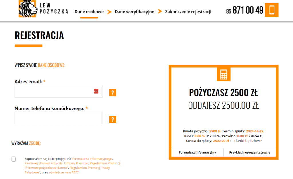 Pierwszym krokiem do otrzymania pożyczki jest rejestracja na stronie Lew Pożyczka. Jednym z etapów jest potwierdzenie tożsamości przez tradycyjny przelew w kwocie 1 gr.