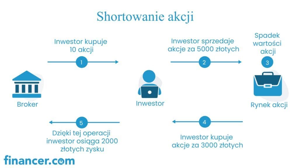Załóżmy, że inwestor shortuje 100 akcji firmy XYZ po cenie 50 złotych za akcję. Sprzedaje je na rynku i otrzymuje 5000 złotych. Następnie cena akcji spada do 30 złotych na akcję, a inwestor decyduje się kupić z powrotem akcje za 3000 złotych. Inwestor odzyskuje akcje i zamyka swoją krótką pozycję, uzyskując zysk w wysokości 2000 złotych (5000 - 3000).