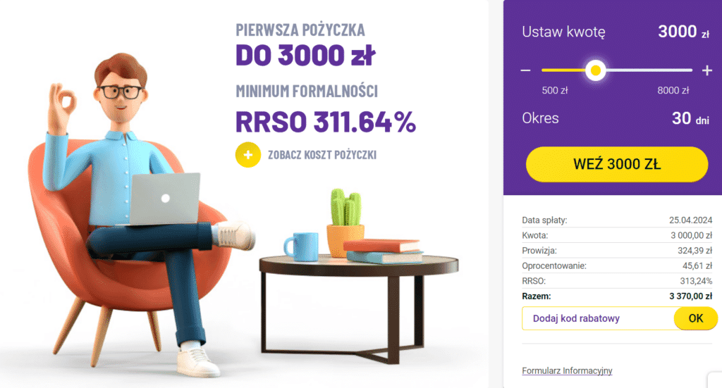 A zatem dla pożyczki 3000 zł, koszty dodatkowe (opłata rejestracyjna i prowizja) oraz oprocentowanie składają się na całkowity koszt 370 zł, co daje RRSO 313,24%. To oznacza, że pożyczając 3000 zł, klient zobowiązany jest zapłacić 3 370 po 30 dniach.